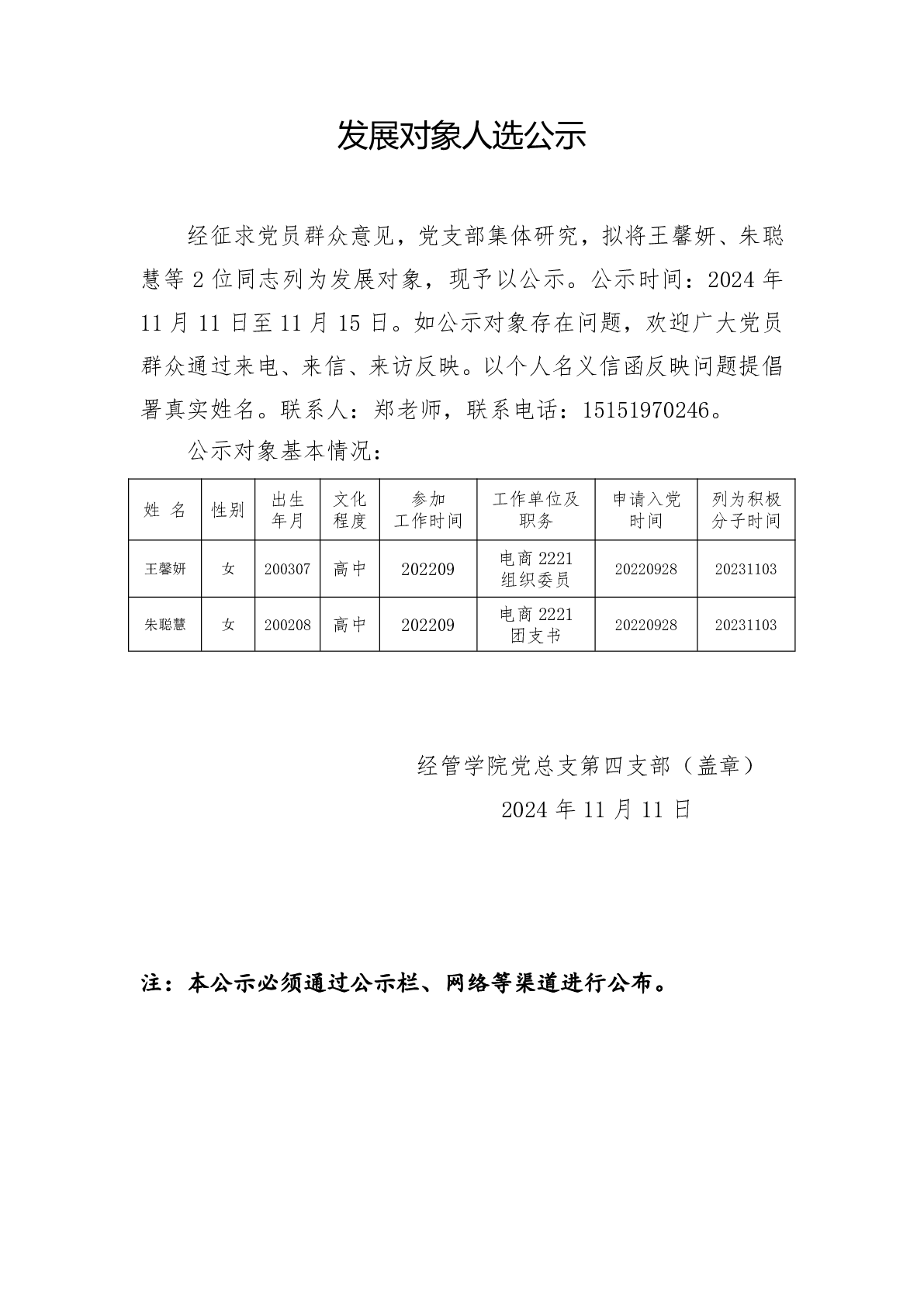 发展对象人选公示(第四支部)